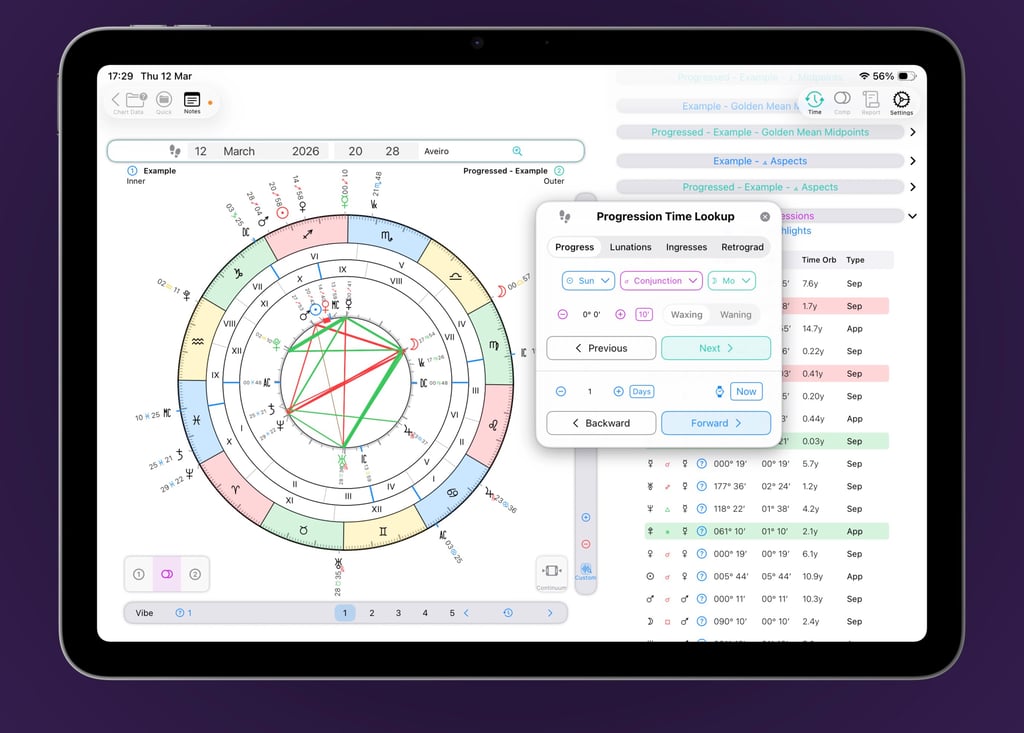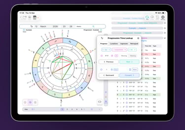 Progressions match that power—and add more. In addition to the same flexible lookup and dynamic time-stepping, you can also search for lunations, ingresses, and retrograde cycles. Everything you expect from transits, now applied to Secondary Progressions.