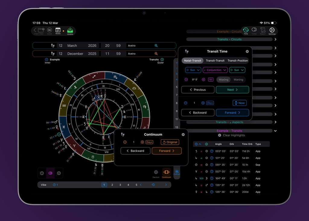 VisualAstro streamlines chart rectification with Continuum feature. Move through time and location data directly from the base wheel, even while working in Transits or Progressions. Adjust parameters, test against events, and update with a single tap. Every vibrational score recalculates in real time—and orange highlights throughout the interface show you're in rectification mode at a glance.