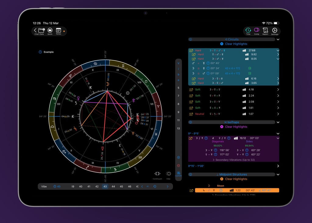 Vibrational Astrology (VA) unlocks a new dimension of chart analysis, but it relies on precise mathematical data that only advanced software can provide. VisualAstro delivers this precision instantly, offering detailed calculations for the core components of VA: circuits, isotraps, and midpoint structures. You can then expand, explore, and visually highlight any of these structures directly on the chart, working with vibrations as integers or decimals for complete analytical freedom.