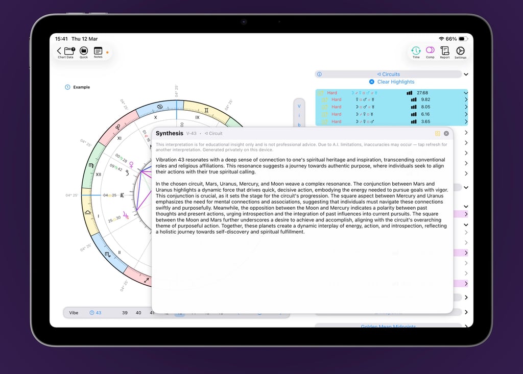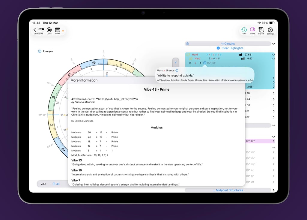 Navigate vibrations effortlessly with intuitive swipe gestures—VisualAstro even keeps a history so you can always retrace your steps. Save your favorite vibrations as shortcuts for instant access, or inspect the natal placements underlying any vibrational chart. For deeper exploration, the Vibration Factor manager lets you jump to higher vibrations, experiment with mathematical constants, and perform numerical operations with ease.