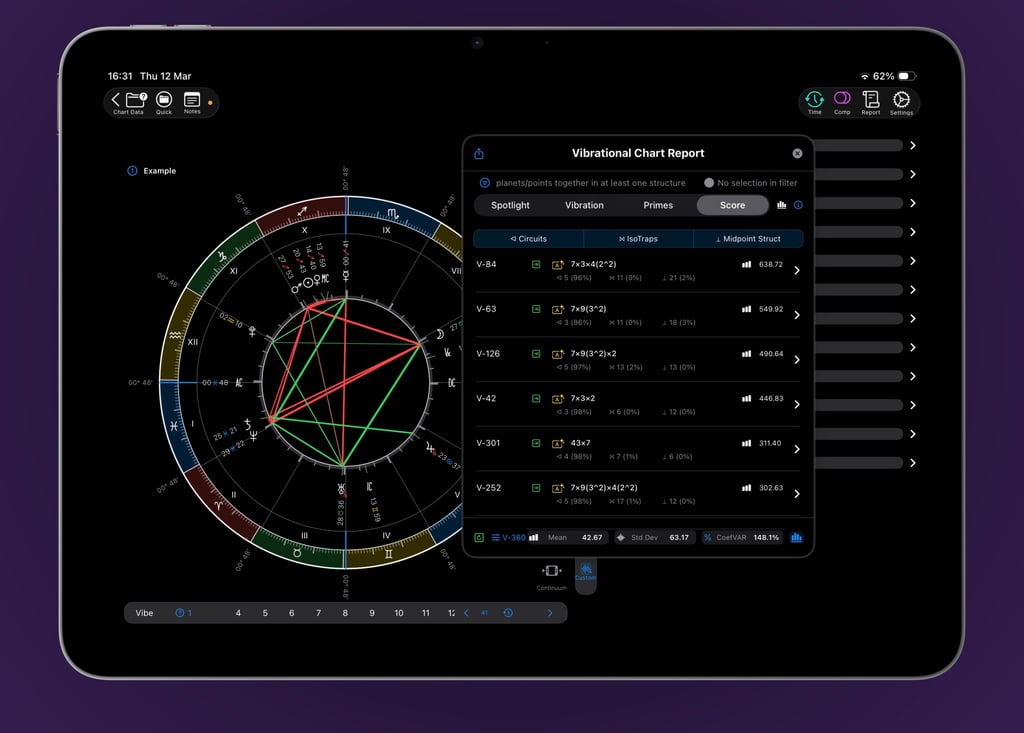 The Vibrational Chart Report transforms raw data into actionable insights. It automatically rates and sorts every vibration, sorted by the most significant ones. You can explore the details behind each rating, filter the results, and see exactly what drives the scores. Then the Spotlight pinpoints critical chart features: quincunxes, 11/24ths, tight conjunctions, multi-planet clusters, and narrow isotraps. All this, and you can even extend the vibration range beyond 360.