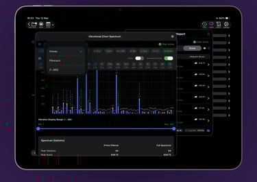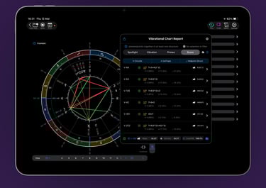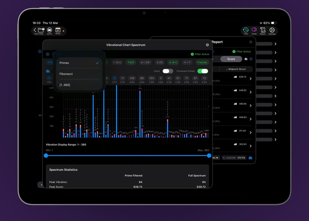 The Vibrational Chart Report comes to life in a dynamic, interactive bar chart. Every rating and vibration is displayed in a clean, compact graph that invites exploration. Tap any bar for deeper insights, apply filters on the fly, or dive into fractals and prominent primes for smart, contextual analysis. This is where the big picture emerges—and your exploration expands.