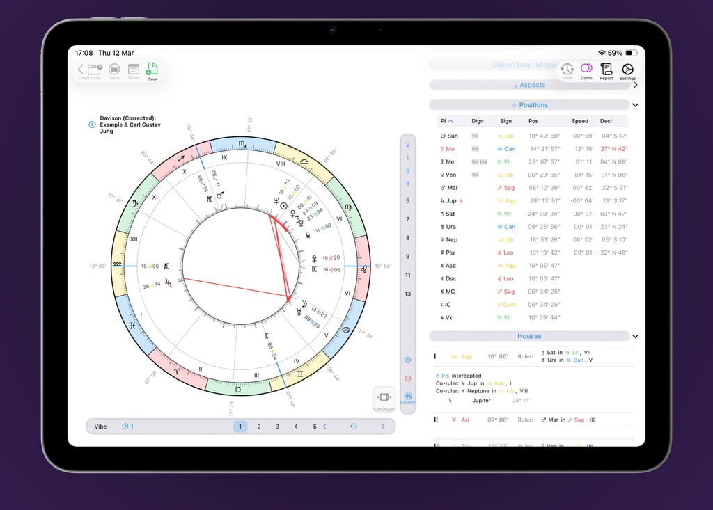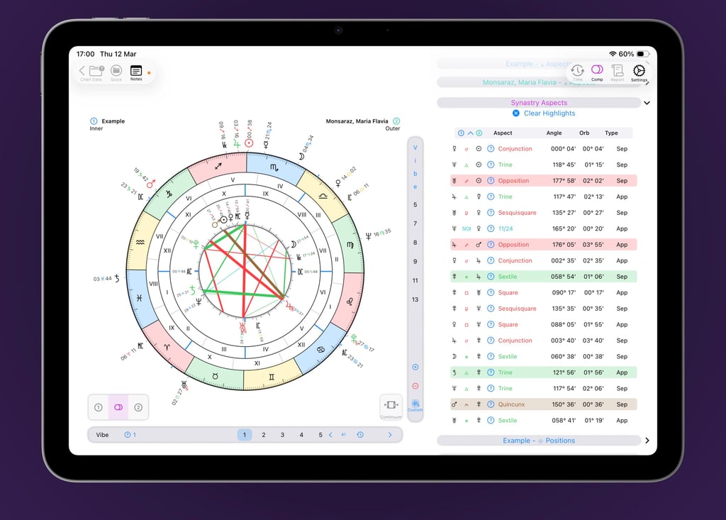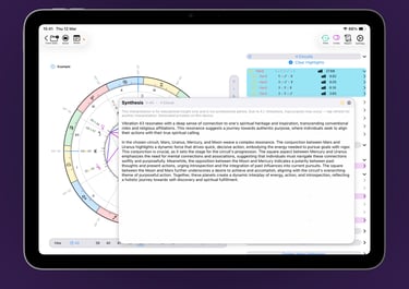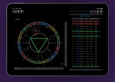 Synastry just got a major upgrade. A single, unified bi-wheel now displays both natal charts and the aspects between them—all in one clean view. Tap to toggle aspects on or off independently, while full reference data remains accessible on the side. Contextual highlighting lets you instantly spot key themes across even the most complex comparisons.