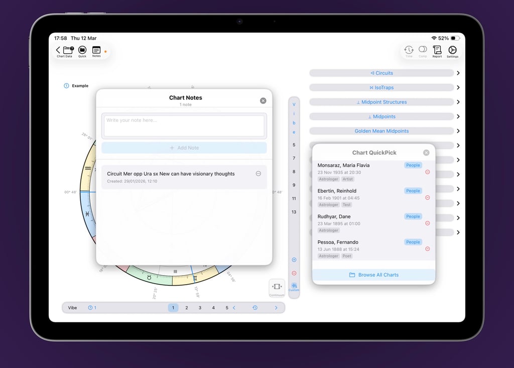 VisualAstro helps you stay organised. Save a curated set of charts in Quick Pick for one-tap access, and keep track of your insights with Notes—fully synchronised across devices via iCloud.