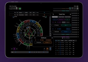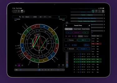 Transits just got more powerful. Beyond the full bi-wheel functionality you already expect, VisualAstro introduces a dedicated transit search tool. Quickly find specific transits—whether Transits-to-Natal, Transits-to-Transits, or Transits to Positions—or step through time dynamically, moving forward or backward by year, month, day, hour, or minute. The Davison chart can also be immediately calculated for transits.